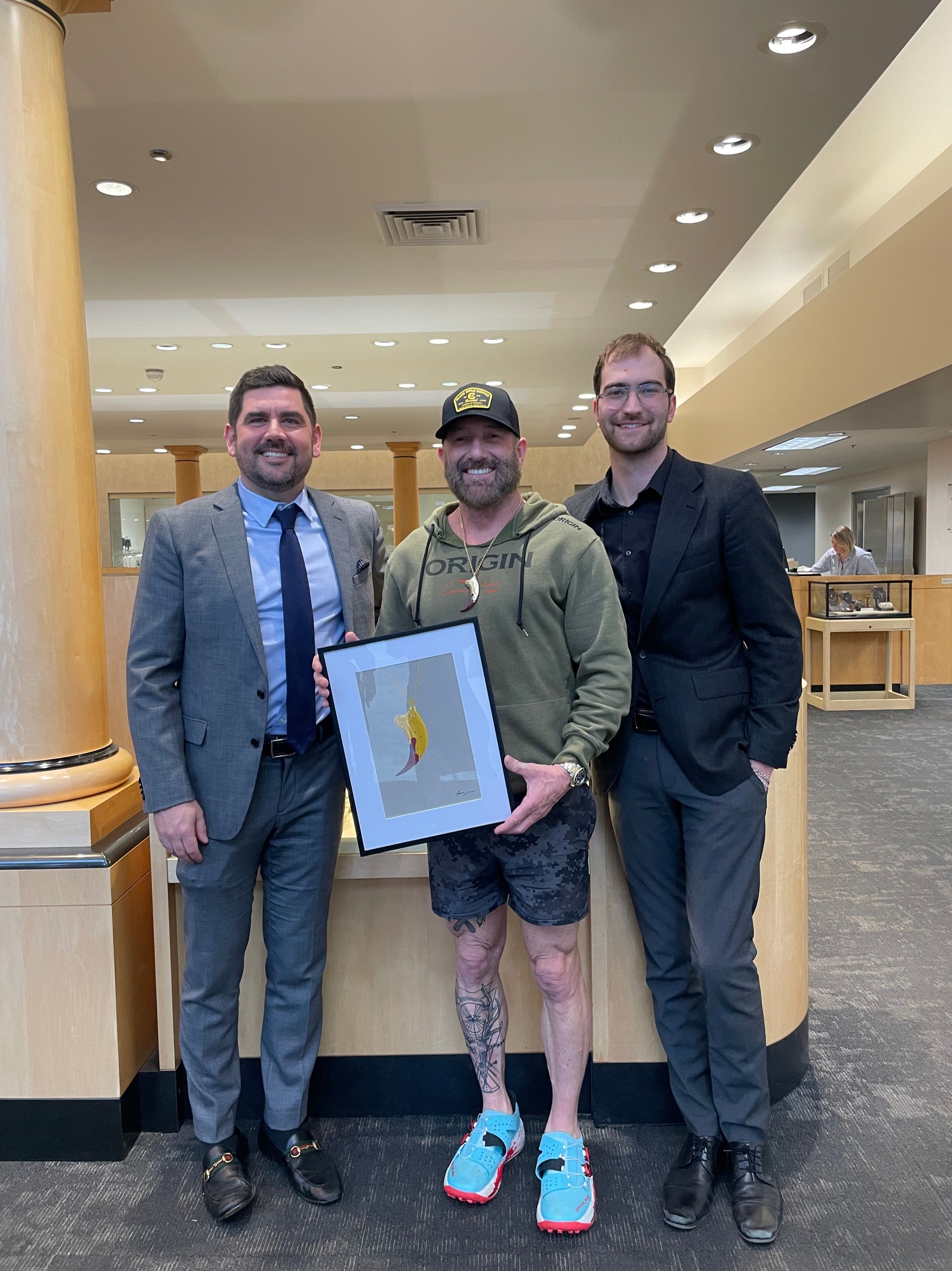 Cameron Hanes, from Eugene, Oregon, is a renowned endurance athlete, an industry-leading bowhunter, an accomplished author, and an entrepreneur. The idea behind this custom was a collaborative effort to create something unique that would reflect Hanes's incredible bowhunter and wildlife expertise. This custom pendant is a recreation of an Alaskan Brown Bear Claw.